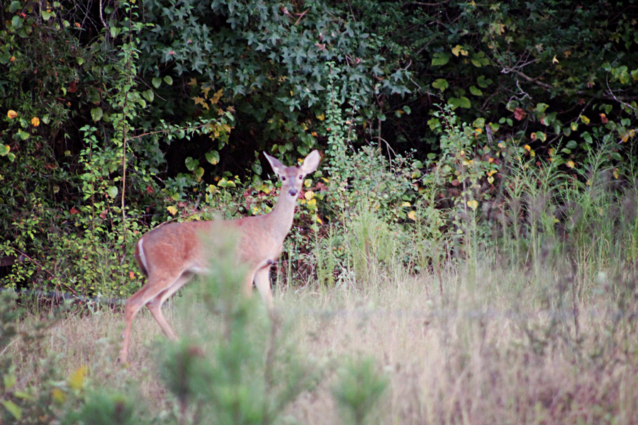 For the past several weeks, we’ve had a pair of deer traipsing up our driveway, sleeping under the mimosa, and picking crabapples from our neighbors’ trees. We think it’s a doe and her baby. This evening, we spotted the larger one in the backyard so I snuck outside to get a few shots. She crossed the pasture next door and vanished into the brush.